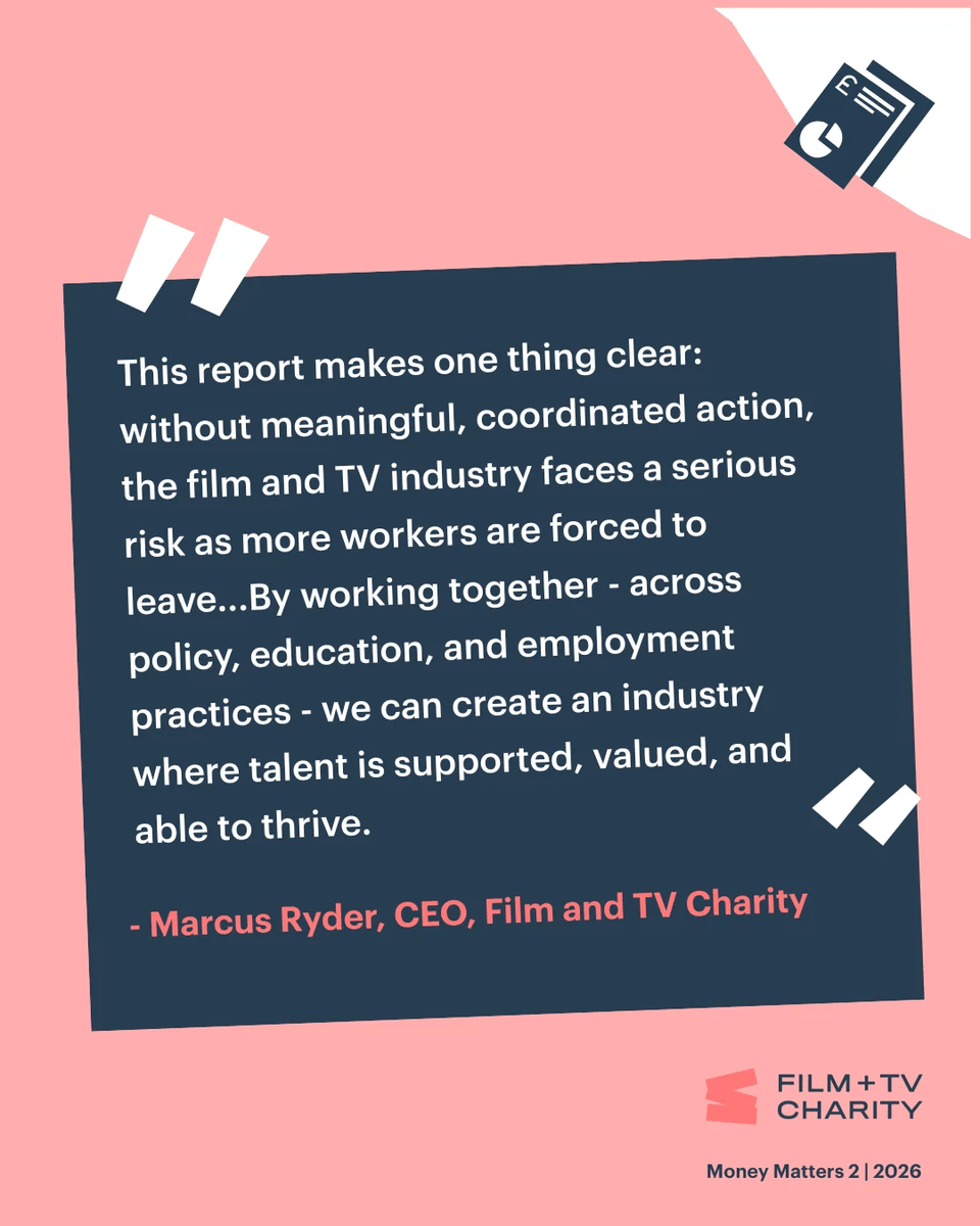 Drawing on insights from over 2,000 people working behind the scenes in film, TV, and cinema, the Film and TV Charity’s latest Money Matters 2 report unfortunately reveals a workforce under mounting financial pressure. Key findings include:
